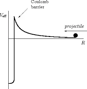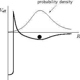 The molecule is a bound state in the shallow but wide minimum of this potential. Most of the time, the nuclei are at the distance corresponding to the maximum of the probability density distribution (shown by the thin curve). Observe that this density is not zero under the barrier (though is rather small) and even at . This means that the system can (with a small probability) jump from the shallow well into the deep well through the barrier, i.e. can tunnel and fuse.