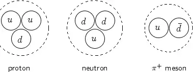 Nucleons are baryons and therefore consist of three quarks while the pion is a meson containing only two quarks, as schematically shown in Fig. 15.7. Comparing this figure with Table 15.4, you can see why quarks have fractional charges. Counting the total charge of a hadron, you should not forget that anti-quarks have the opposite charges. The baryon number for an anti-quark also has the opposite sign (negative). This is why mesons actually consist of a quark and anti-quark in order to have total baryon number zero.