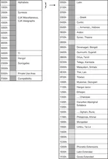 Basic Multilingual Plane (BMP), or Plane 0, is most commonly in general documents. Code points are allocated for common characters in contemporary scripts with exactly the same set as ISO/IEC 10646-1, as summarized in Figure 2 in section ý0 Note that the code points between E000 and F900 are reserved for the vendors' private use. No character is assigned in this area.