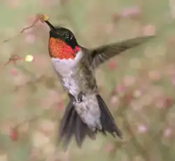 The Ruby-throated Hummingbird (Archilochus colubris), is a small hummingbird. It is the most common species of hummingbird in the eastern half of North America and the only hummingbird that breeds east of the Mississippi River.