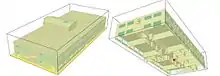 A three-floors university building is modeled. A 1500 kW fast fire is positioned at ground floor near the main entrance. The calculation domain is divided into three MESHs for parallel calculation. Round geometries are exported to FDS notation.