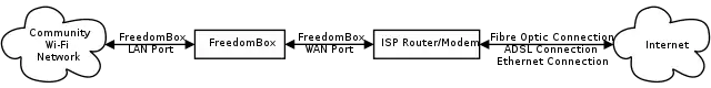 FreedomBox acts as the centre piece in a community network providing Wi-Fi coverage over large areas. FreedomBox receives the Internet connectivity then distributes it along with various other digital services to all the devices in the network.