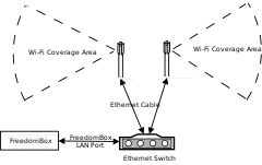 Wi-Fi access points can be setup to provide Wi-Fi coverage across the entire community area. There are two primary ways to connect all Wi-Fi access points into a single network that is connected to FreedomBox.