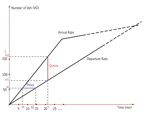 Based on the departure rate and arrival rate pair data, the delay of every individual vehicle can be obtained. Using the input-output (I/O) queueing diagram shown in the side figure, it is possible to find the delay for every individual vehicle: the delay of the vehicle is time of departure - time of arrival (). Total delay is the sum of the delays of each vehicle, which is the area in the triangle between the arrival (A(t)) and departure (D(t)) curves.