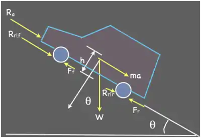 For highway design, analysis of braking is simplified by assuming that deceleration is caused by the resisting force of friction against skidding tires. This is applicable to both an uphill or a downhill situation. A vehicle can be modeled as an object with mass sliding on a surface inclined at angle .