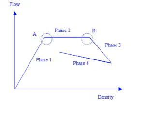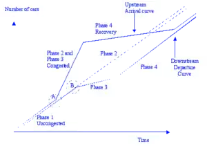 While traffic flow theorists represent traffic as if it were a fluid, queueing analysis essentially treats traffic as a set of discrete particles. These two representations are not-necessarily inconsistent. The figures to the right show the same 4 phases in the fundamental diagram and the queueing input-output diagram. This is discussed in more detail in the next section.