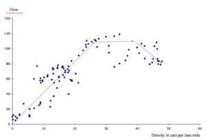 Actual traffic data is often much noisier than idealized models suggest. However, what we tend to see is that as density rises, speed is unchanged to a point (capacity) and then begins to drop if it is affected by downstream traffic (queue spillbacks). For a single link, the relationship between flow and density is thus more triangular than parabolic. When we aggregate multiple links together (e.g. a network), we see a more parabolic shape.