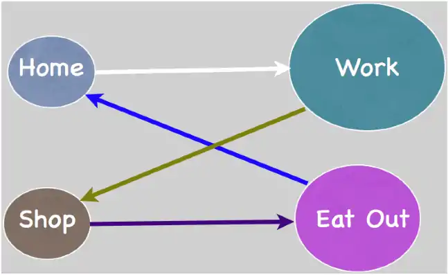People engage in activities in sequence, and may chain their trips. In the Figure below, the trip-maker is traveling from home to work to shop to eating out and then returning home.