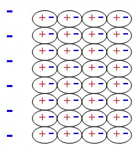 A charged rod is brought near the surface of the crystal. {Note: the rod is not shown, just the charges on it}. The electrons in the atoms try to get away from the negative charge because they are repelled. The positive charges in the nucleus try to get nearer to the negative rod because they are attracted to it. The result is the atom slightly changes shape. The center of the negative charges goes to the right of the center of the atom and the center of the positive charges goes to the left. We say there is a separation of charges