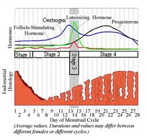 Stage 3. Day 14. The egg (called an ovum) is released. This is due to LH.