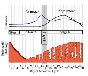 Stage 1. Days 1-4. Menstruation (bleeding) occurs. The lining of the uterus disintegrates and is shed. This is due to low levels of progesterone.