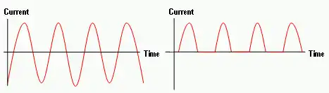The graph on the left shows AC current. Note that the current cycles positive, negative, positive, and so on. The electricity is flowing to and fro. Putting the current through a diode has the result seen on the right. The positive part of the cycle in unaffected, but the negative is wiped out. The current goes positive, zero, positive.