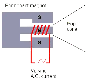 A speaker is made of a paper cone attached to a coil which acts as a small electromagnet. The coil is fitted over a permanent magnet, and as the current flows through the coil it is either attracted or repelled depending on which direction the current flows. A typical signal from an amplifier will be a varying current, and so the cone will vibrate back and forth at the same frequency as the current. As the cone vibrates, it sets up pressure waves in the air, which we hear as sound.