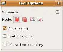 Scissors is an interesting selection tool. It has some features of lasso, some features of paths tool and some of its own. It is useful for selecting a region defined by strong colour changes at the edges. To use scissors, you need to create a set of 'control nodes' (also referred to as anchors), at the edges of the region you are willing to select. The tool creates a curve through these nodes, following any high-contrast it can find. Each time you press left mouse button, you create a new anchor that is connected to the last control node by a curve. If you want to finish the selection, just press on the first node you've created. After that you can adjust the selection by modifying the curves or by moving/creating new nodes. When you are satisfied just press anywhere inside of the selection to create it.
