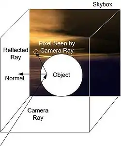 The illustration to the left depicts the concept of reflection mapping with a static skybox: a view ray is reflected at a point on the surface of an object and the reflected ray is intersected with the skybox to determine the color of the corresponding pixel. The skybox is just a large cube with textured faces surrounding the whole scene. It should be noted that skyboxes are usually static and don't include any dynamic objects of the scene. However, “skyboxes” for reflection mapping are often rendered to include the scene from a certain point of view. This is, however, beyond the scope of this tutorial. Moreover, this tutorial covers only the computation of the reflection, it doesn't cover the rendering of the skybox.
