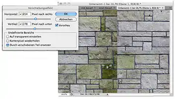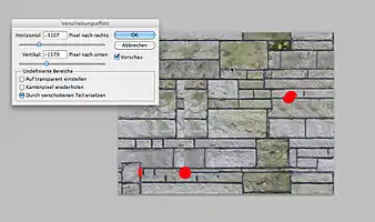 A great, very useful helper is the Photshop filter->sonstige Filter-> Verschiebungseffekt.