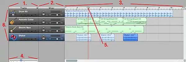 In this field of the GarageBand interface you can move around your loops and recordings, you can add new instruments, change their volumes and pan them to the left or to the right.