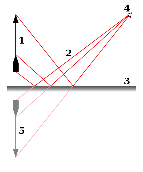 In this illustration, the reflected light rays reaching the eye from an object produce the illusionary appearance of a reversed-image object behind the mirror. |