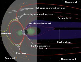 The Earth is surrounded by a magnetic field, called the Magnetosphere that forms a barrier to the solar wind. The solar wind pressure strongly compresses the magnetosphere on the sun-side and draws it out into an extremely long tail on the side opposite. Since the charged particles of the solar wind cannot cross the Earth's magnetic field lines, flow around it . This forms a standing shock wave in space upstream of the Earth, called the Bow Shock. Electrons of the solar wind diffuse into Magnetospheric tail and form a reservoir called the Plasma Sheet. The Magnetosphere and the solar wind form an enormous electrical dynamo where large and complicated electrical currents flow. One component of these currents is carried by the Electrons in the Plasma Sheet, which descends down from 300 km to 100 km following spiral paths along magnetic field lines. These particles then collide with the atmospheric gas causing it to glow, which we call Aurora.[9]