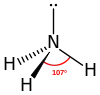 The VSEPR model treats lone electron pairs in a similar way to bonding electrons. In ammonia (NH3) for example, there are three hydrogen atoms and one lone pair of electrons surrounding the central nitrogen atom. Because there are four groups, ammonia has a tetrahedral shape but unlike methane, the angle between the hydrogen atoms is slightly smaller, 107.3°. This can be explained by theorizing that lone electron pairs take up more space physically than bonding pairs. This is a reasonable theory: in a bond, the electron pair is distributed over two atoms whereas a lone pair is only located on one. Because it is bigger, the lone pair forces the other electron pairs together.