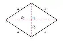 Because the rhombus is a parallelogram, the area also equals the length of a side (B) multiplied by the perpendicular distance between two opposite sides(H)