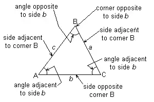 If one of the sides of a triangle is chosen, the interior angles of the corners at the side's endpoints can be called adjacent angles. The corner which is not one of these endpoints can be called the corner opposite to the side. The interior angle whose vertex is the opposite corner can be called the angle opposite to the side. Likewise, if a corner or its angle is chosen, then the two sides sharing an endpoint at that corner can be called adjacent sides. The side not having this corner as one of its two endpoints can be called the side opposite to the corner. The sides or their lengths of a triangle are typicaly labeled with lower case letters. The corners or their corresponding angles can be labeled with capital letters. The triangle as a whole can be labeled by a small triangle symbol and its corner points. In a triangle, the largest interior angle is opposite to longest side, and vice versa. Any triangle can be divided into two right triangles by taking the longest side as a base, and extending a line segment from the opposite corner to a point on the base such that it is perpendicular to the base. Such a line segment would be considered the height or altitude ( h ) for that particular base ( b ). The two right triangles resulting from this division would both share the height as one of its sides. The interior angles at the meeting of the height and base would be 90o for each new right triangle. For acute triangles, any of the three sides can act as the base and have a corresponding height. For more information on right triangles, see Right Triangles and Pythagorean Theorem.