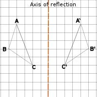 Look at the diagram on the right. Imagine you are given the left part. How can you reflect the figure? First, Find out the distance between A and the axis. That's four. Then find point A′ (pronounced 'A prime'), which should be the same distance from the axis but on the different side. Look at the figure that is on the right of the figure. If you found that point, you're right. Put a little cross there - if your teacher doesn't let you do it, just erase it later! Now do the same for the other two points. Join them up. Now you have formed the reflected figure!