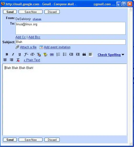 First you will notice that there are three new buttons that have appeared. These buttons are in the following order: Send, Save Now, and Discard. The Send button is only pressed once you have completed composing your email in order to send the email to the addressee. The Save Now button is used to save the email to your account's draft folder in order to access it, and maybe finish writing the email, in a later time. The Discard button is used when you would like to discard the email or better said, delete the email. Take note that when you discard an email it is deleted and unrecoverable.