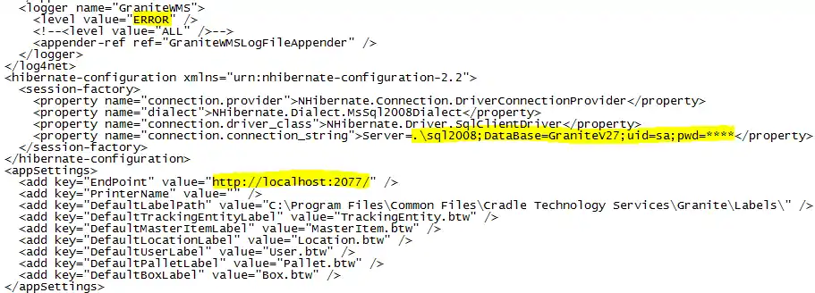 - Open the label printing config file named “Granite.LabelPrinting.exe.config”