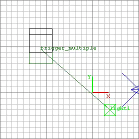 Everything still isn't fine, since, right now the trigger will fire continuously as long as you hold down the button, so since you don't want that add the property wait with a value of 1 to make it wait one second between the triggerings. Now that the trigger is set up, create a light (you should know how by now), then deselect everything (ESC). Then select the trigger brush, and then the light (SHIFT+LMB) and press CTRL+K to connect them. If everything is done correctly, a line will appear between the two entities, if not, try again.