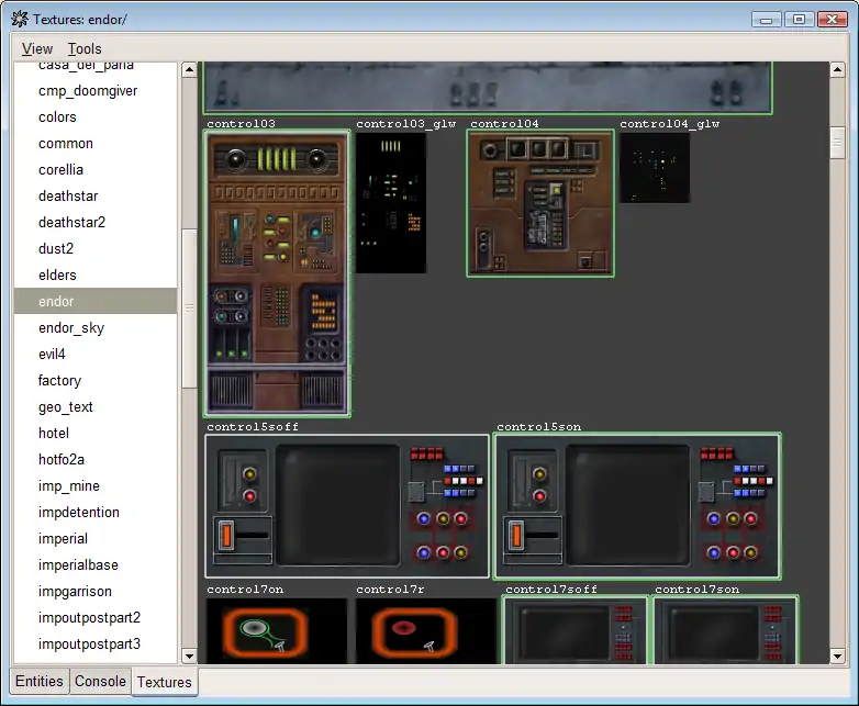 In the Texture List, all textures (and shaders) in the current texture folder are listed. Note that the border can be either green, white, both or none. White means the texture is a shader, green means the texture is used in the current map, and both green and white means the texture is a shader and currently in use.