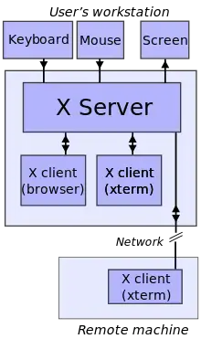 When an X client connects to the X server (on the same or different computer), it speaks version 11 of the X protocol. This is how the client tells the server what to draw, and the server tells the client what the keyboard and mouse input is. The many X clients never need to know about the hardware or operating system of the X server, because the X server controls the console. Clients like Firefox and OpenOffice.org only need to know X protocol.