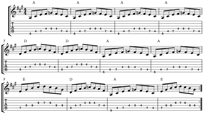 Here is a blues exercise in A using sevenths.