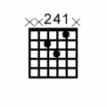 The partial seventh chords below are to be played as stab chords. Play these partial chords on the back beat (play the chord on the snare) using a down-stroke to add to the rhythmic drive. Note that the second finger remains on the same string. This allows easy movement between the chords and fast tempos can be achieved with ease.