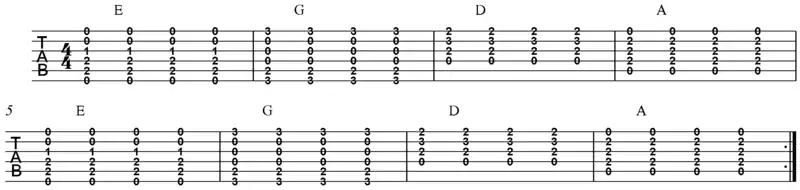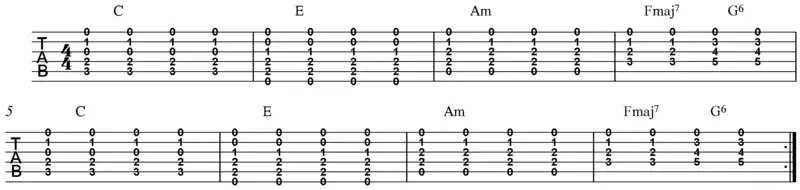 Note the open string of the Fmaj7 and G6 chord.