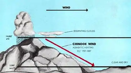 Foehn winds or Chinook winds develop when air is forced up over a mountain range. This takes place, for example, when the westerly winds bring air from the Pacific Ocean over the Sierra Nevada Mountains in California. As the relatively warm, moist air rises over the windward side of the mountains, it cools and contracts. If the air is humid, it may form clouds and drop rain or snow. When the air sinks on the leeward side of the mountains, it forms a high pressure zone. The windward side of a mountain range is the side that receives the wind; the leeward side is the side where air sinks.