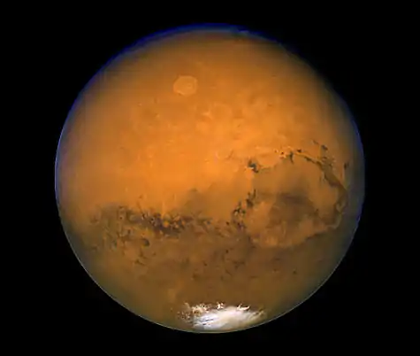 Mars, shown in Figure 25.15, is the fourth planet from the Sun, and the first planet beyond Earth's orbit. The Martian atmosphere is thin relative to Earth's and with much lower atmospheric pressure. Unlike Earth’s neighbor on the side nearer the sun, Mars has only a weak greenhouse effect, which raises its temperature only slightly above what it would be if the planet did not have an atmosphere.