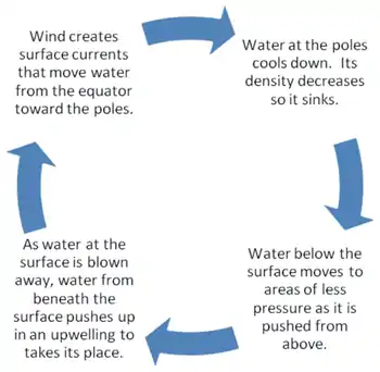 As you have seen, water that has greater density usually sinks to the bottom. However, in the right conditions, this process can be reversed. Denser water from the deep ocean can come up to the surface in an upwelling (Figure 14.18). Generally, an upwelling occurs along the coast when wind blows water strongly away from the shore. As the surface water is blown away from the shore, colder water from below comes up to take its place. This is an important process in places like California, South America, South Africa, and the Arabian Sea because the nutrients brought up from the deep ocean water support the growth of plankton which, in turn, supports other members in the ecosystem. Upwelling also takes place along the equator between the North and South Equatorial Currents.