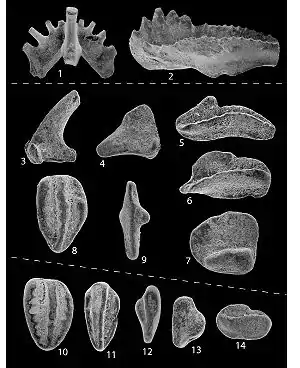 From 1856 onwards paleontologists noticed that the fossils record from the Cambrian period right through to the end of the Triassic was littered with microfossils known as conodont structures. They guessed, correctly as it happens, that these were the scattered teeth of some unknown type of otherwise soft-bodied organism. The photomicrograph to the right shows some conodont structures.