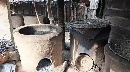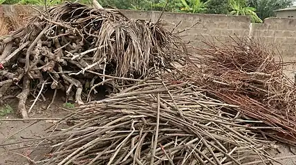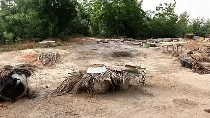 The transportation of salt and other goods was done by human means. The carrier carried 40 to 50 kilograms of salt. The load was carried at 800-1000 meters at a time, then rested on a tree branch, using a carrying stick as a support. The average caravan day trip was 25 kilometers, with an estimated one month from 400 kilometers from Djougou to the coast at Grand-Popo.[27]