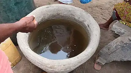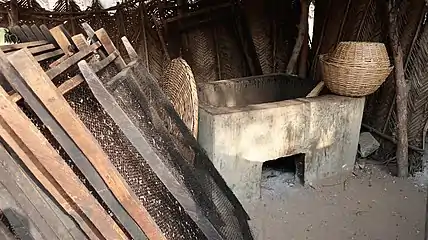 Salt production was a major industry and it was sold to inland. The salt was obtained when the lagoon was dry by scrubbing the soil at its bottom, which was collected in heaps. As the water rose, they were transferred to villages and warehouses. The gathered material was collected in containers about 1.2 meters in diameter, where it was watered and sieved with basket weaves. The water was boiled over the ovens, which were heated by burning the mangrove branches and palm seed skins.[20]