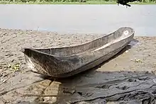 At Lake Nokoué, women's trade canoes were used as "mosquito canoes", often smaller than men's fishing canoes.[28] Larger, up to 12 meters long and 140 centimeters wide, could carry 20-30 people or 2-3 tons of cargo.[29] They were able to travel long distances and carry a variety of goods. They had a crew of 4 to 6 people and were moved either by pole or paddle, but they could also have mast and sail. The largest lagoon boats were flat, up to 20 meters long and 4-5 meters wide. The number of drivers was 4-6 and the cargo could be five tons or up to 70 people. They were used between major villages and ports.
