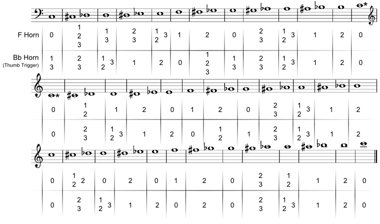 The horn spans four plus octaves depending on the player and uses both the treble and bass clefs. In this chart it is assumed the player is using a double-horn with F and Bb sides. The number 1 indicates that the index-finger valve should be depressed, the number 2 indicates that the middle-finger valve should be depressed and the number 3 indicates that the ring-finger valve should be depressed. There are eight possible valve combinations among the first, second and third valves: 0, 1, 2, 3, 1-2, 1-3, 2-3, and 1-2-3. However, there are effectively seven combinations, because 1-2 will produce the same notes, perhaps slightly out of tune, as 3 alone. One depresses the thumb key to use the Bb side of the horn. And it is so freaking hard to listen for your notes.