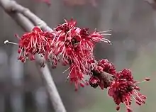 The flowers are regular, pentamerous, and borne in racemes, corymbs, or umbels. They have five sepals, five petals about 1 to 6 mm long, 12 stamens about 6–10 mm long in two rings of six, and two pistils or a pistil with two styles. The ovary is superior and has two carpels, whose wings elongate the flowers, making it easy to tell which flowers are female. Maples flower in late winter or early spring, in most species with or just after the leaves appear, but in some before them.