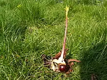 It grows to 36 m tall, with a domed crown of stout branches, on old trees the outer branches often pendulous with curled-up tips. The leaves are opposite and palmately compound, with 5-7 leaflets; each leaflet is 13–30 cm long, making the whole leaf up to 60 cm across, with a 7–20 cm petiole. The flowers are usually white with a small red spot; they are produced in spring in erect panicles 10–30 cm tall with about 20-50 flowers on each panicle. Usually only 1-5 fruit develop on each panicle; the fruit is a green, softly spiky capsule containing one (rarely two or three) nut-like seeds called conkers or horse-chestnuts. Each conker is 2–4 cm diameter, glossy nut-brown with a whitish scar at the base.