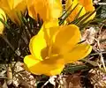 Crocus is a genus of perennial flowering plants, native to a large area from coastal and subalpine areas of central and southern Europe (including the islands of the Aegean), North Africa and the Middle East, across Central Asia to western China. The genus Crocus is placed botanically in the iris family (Iridaceae). There are about eighty species, of which approximately 30 are cultivated.