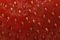 The strawberry is an accessory fruit, meaning that the fleshy part is derived not from the ovaries (which are the "seeds", or achenes) but from the peg at the bottom of the hypanthium that held the ovaries. So from a technical standpoint, the seeds are the actual fruits of the plant, and the flesh of the strawberry is modified receptacle tissue. It is greenish-white as it develops and in most species turns red when ripe.