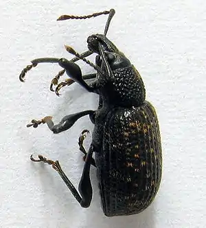 The black vine weevil, Otiorhynchus sulcatus, is native to Europe, but common in North America as well. This weevil is a pest of many garden plants, causing the most damage on evergreen trees and shrubs.