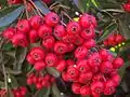 Firethorn (Pyracantha) is a genus of thorny evergreen large shrubs in the family Rosaceae, subfamily Maloideae. They are native from southeast Europe east to southeast Asia, and are closely related to Cotoneaster, but have serrated leaf margins and numerous thorns (Cotoneasters are thornless).