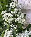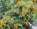 Pyracanthas are valuable ornamental plants, grown in gardens for their decorative flowers and fruit, often very densely borne. Their dense thorny structure makes them particularly valued in situations where an impenetrable barrier is required. The aesthetic characteristics, in conjunction with their home security qualities, makes them a considerable alternative to artificial fences and walls[1][2] They are also a good shrub for a wildlife garden, providing dense cover for roosting and nesting birds, summer flowers for bees and an abundance of berries as a food source. Pyracantha berries are not poisonous as commonly thought; although they are very bitter, they are edible when cooked and are sometimes made into jelly.[3]
